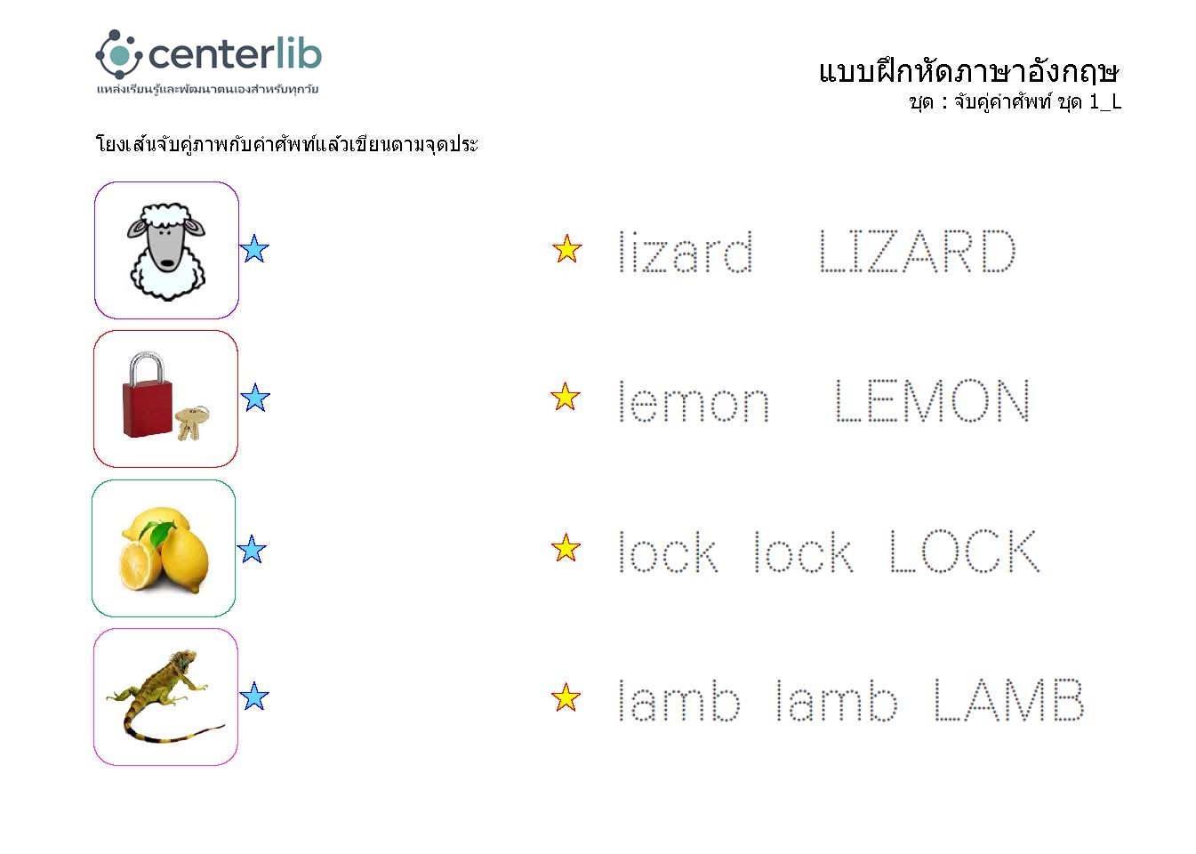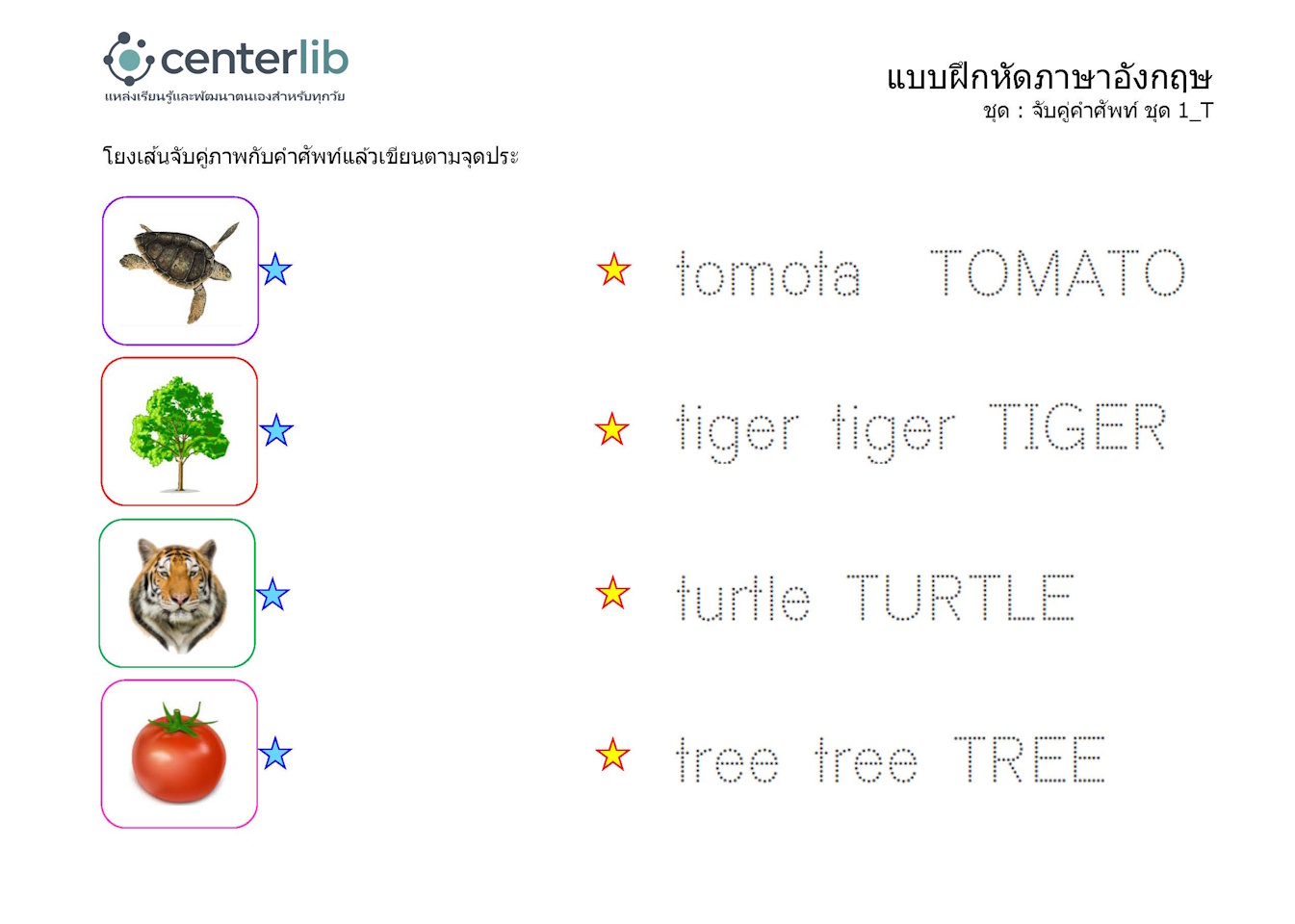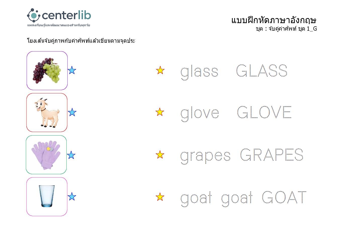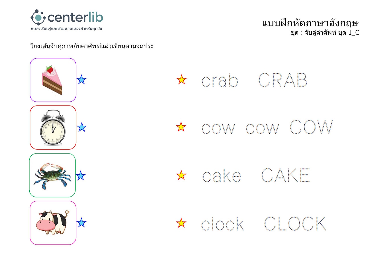 ลากเส้นตามรอยประ และจับคู่คำศัพท์