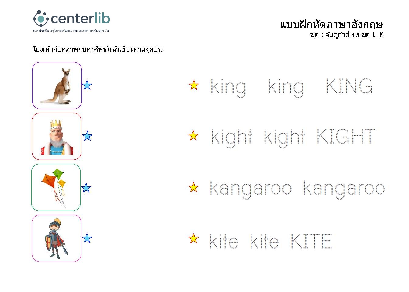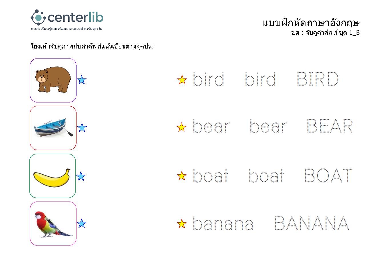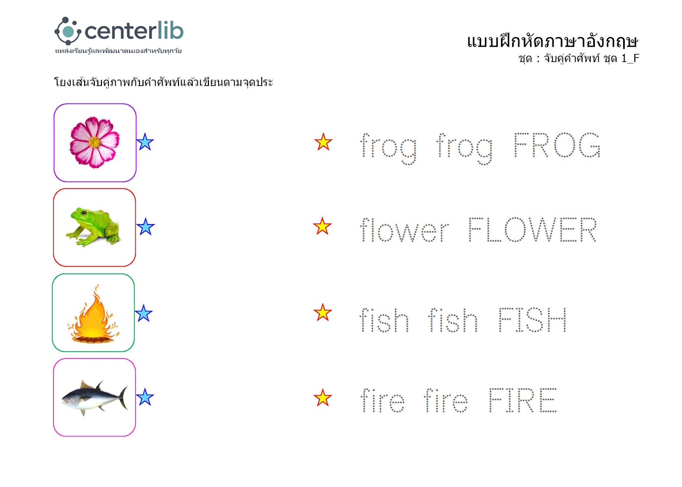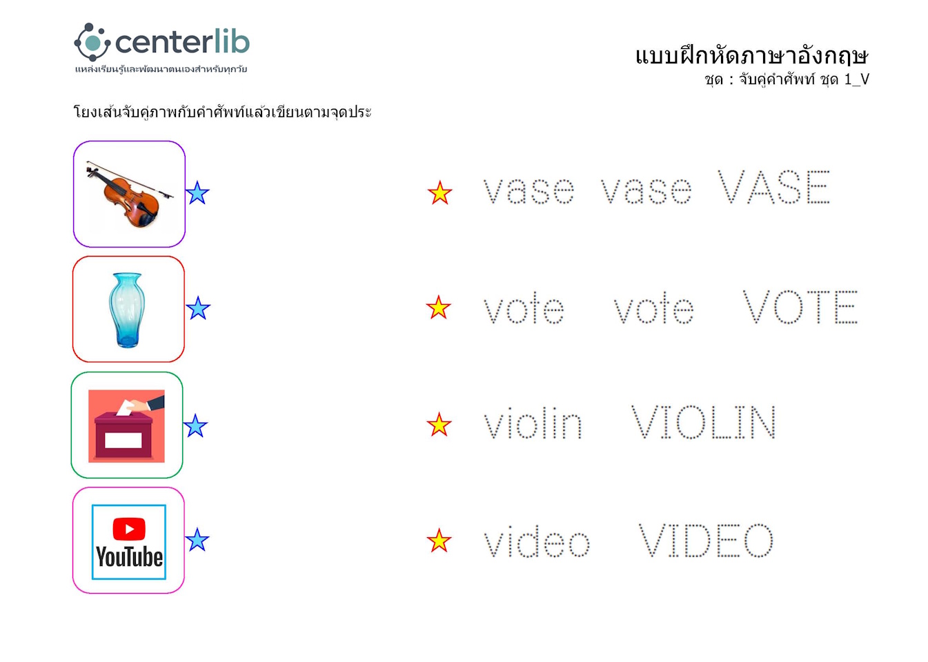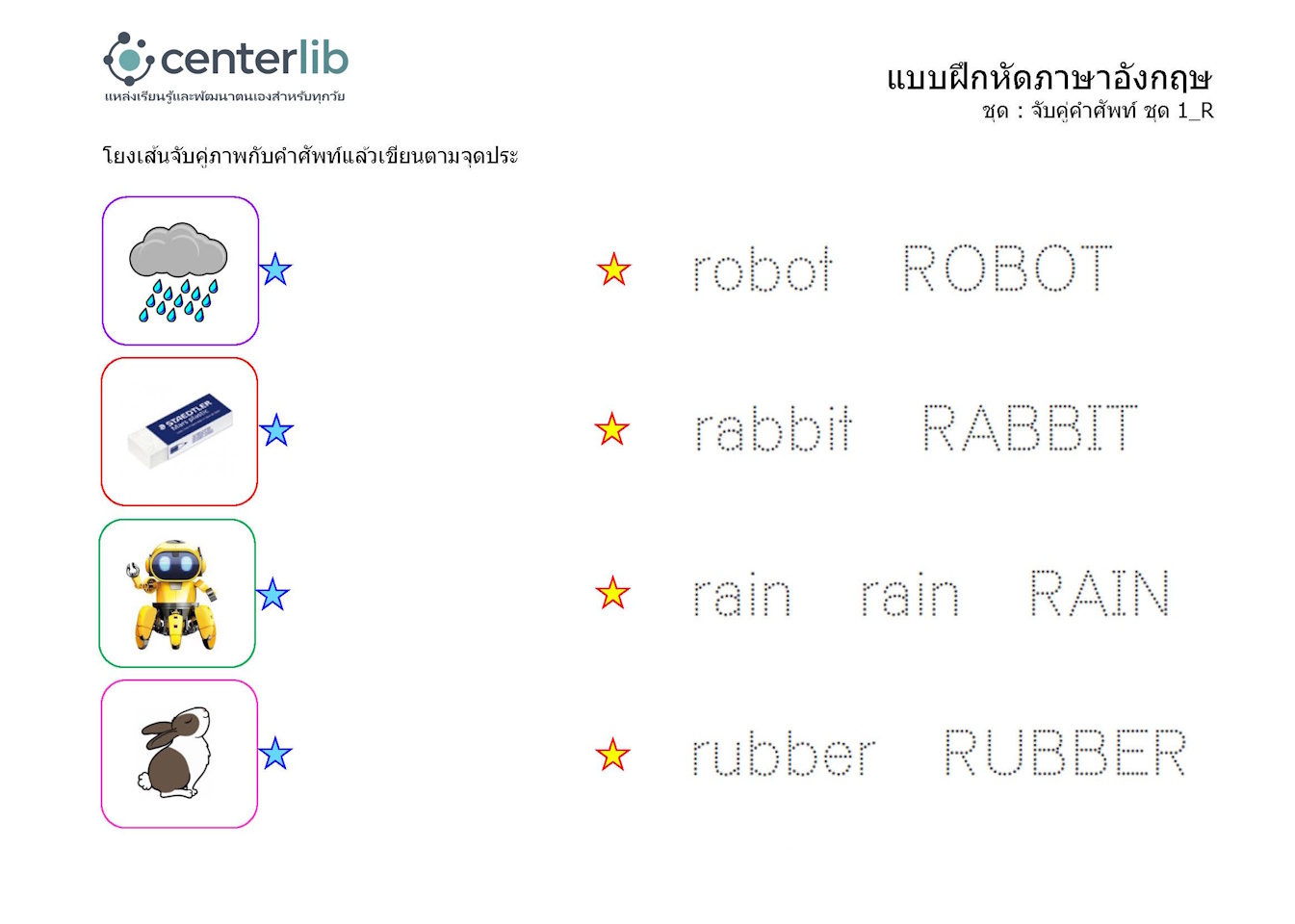 ลากเส้นตามรอยประ และจับคู่คำศัพท์