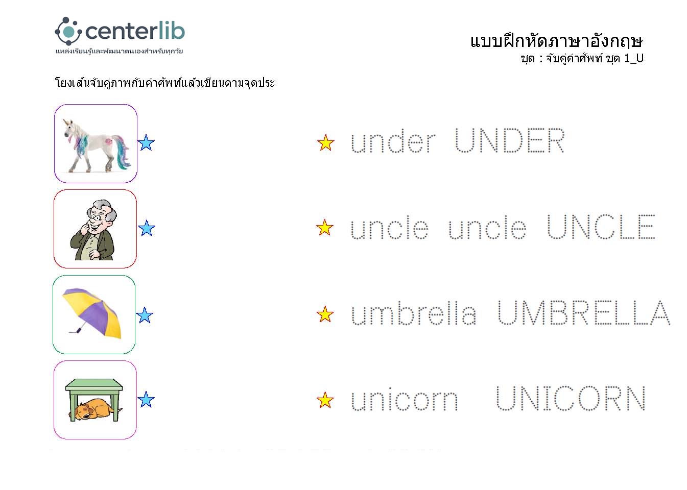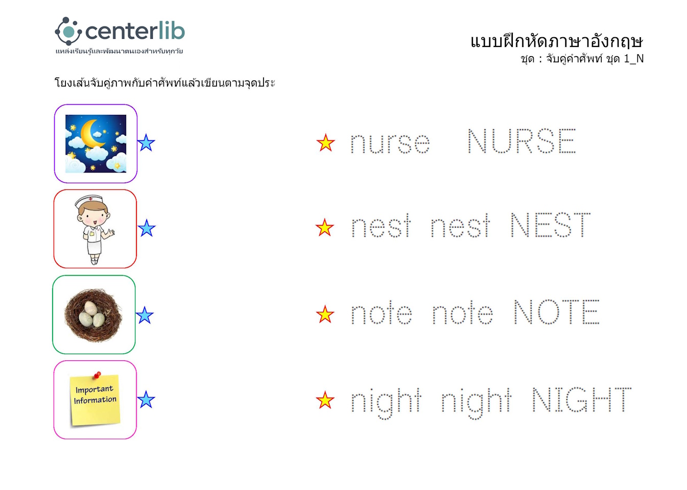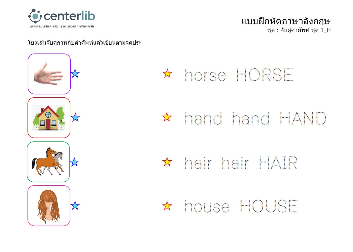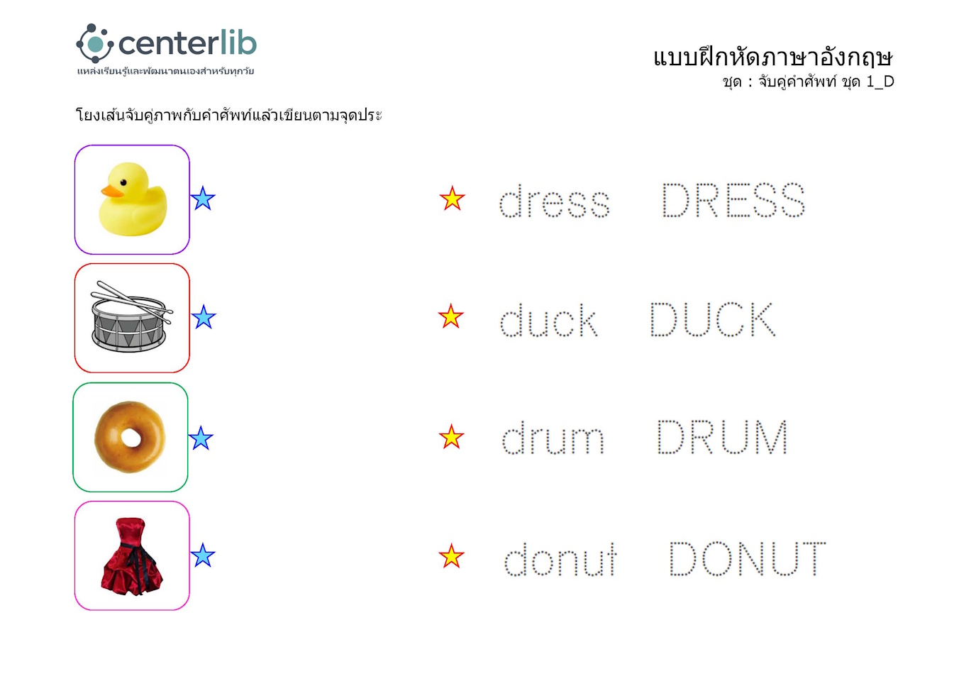 ลากเส้นตามรอยประ และจับคู่คำศัพท์