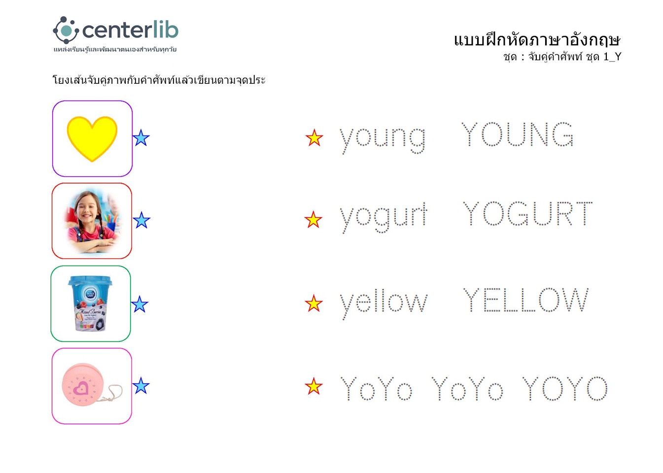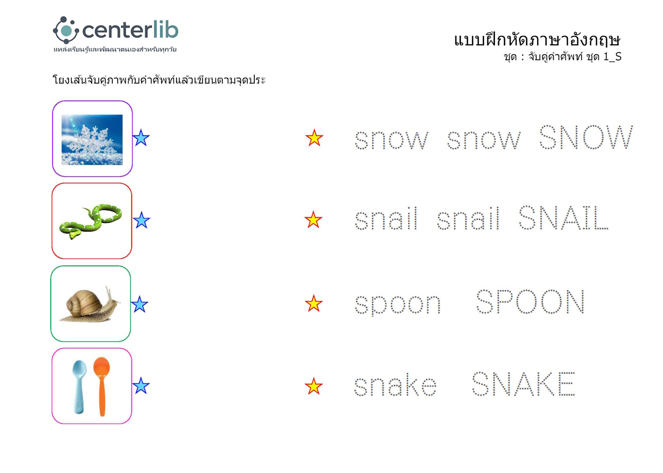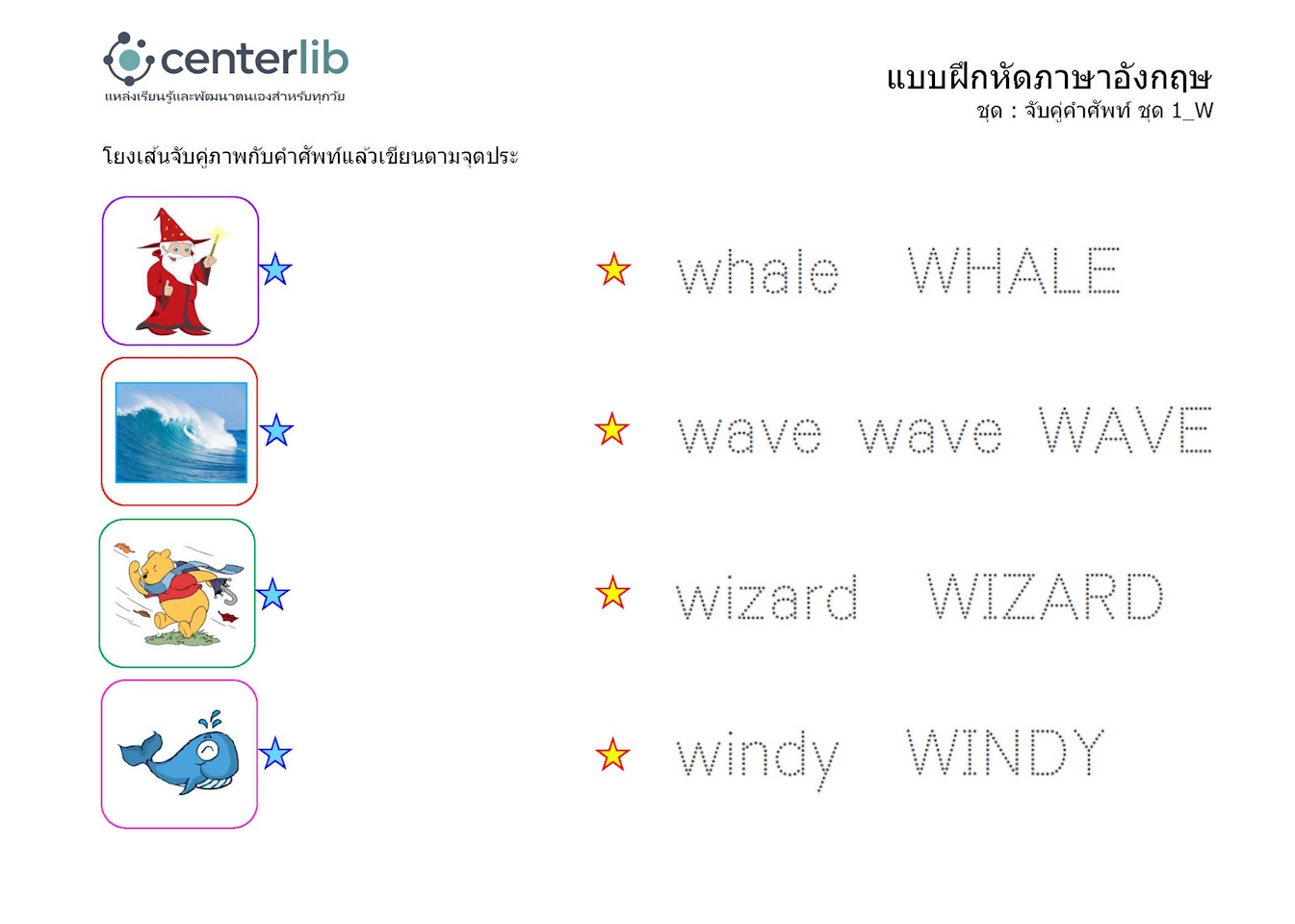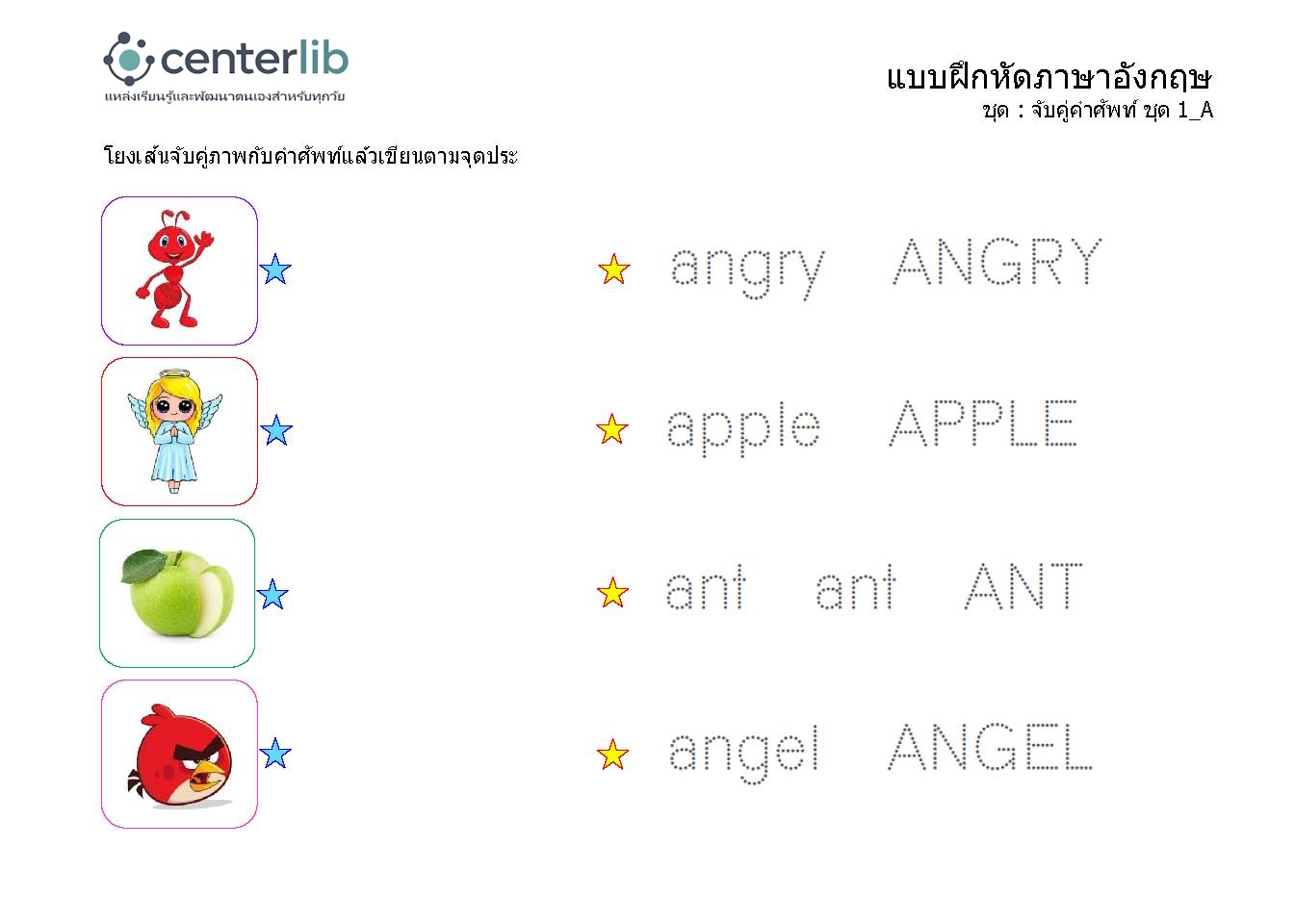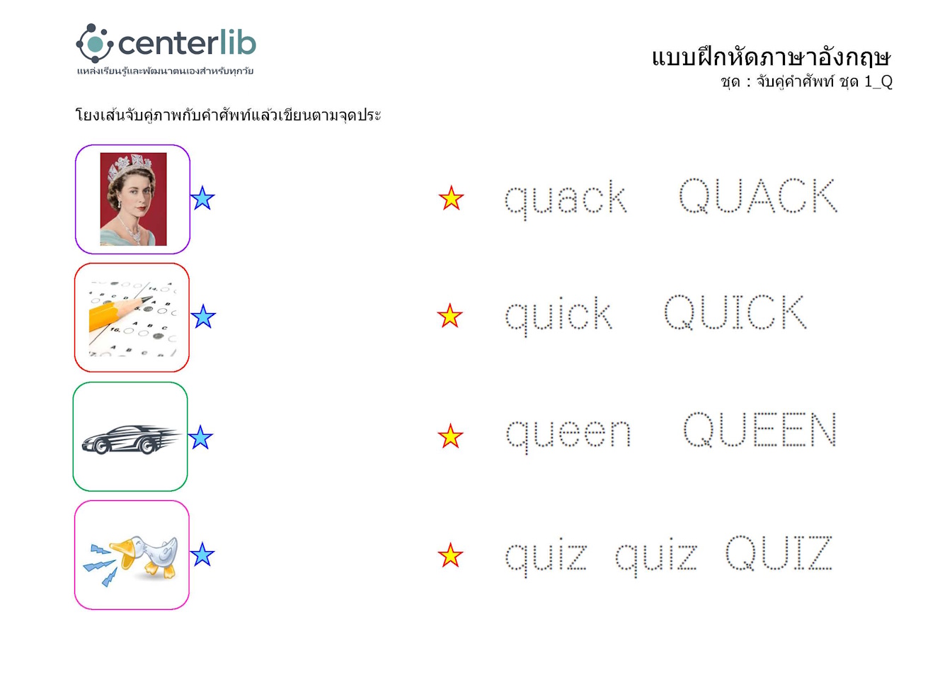 ลากเส้นตามรอยประ และจับคู่คำศัพท์