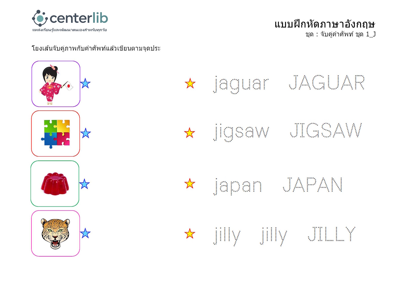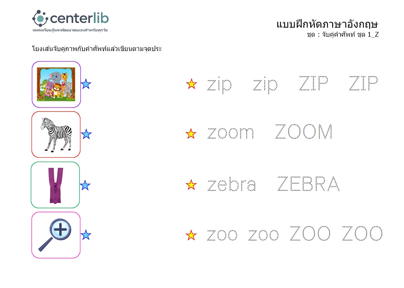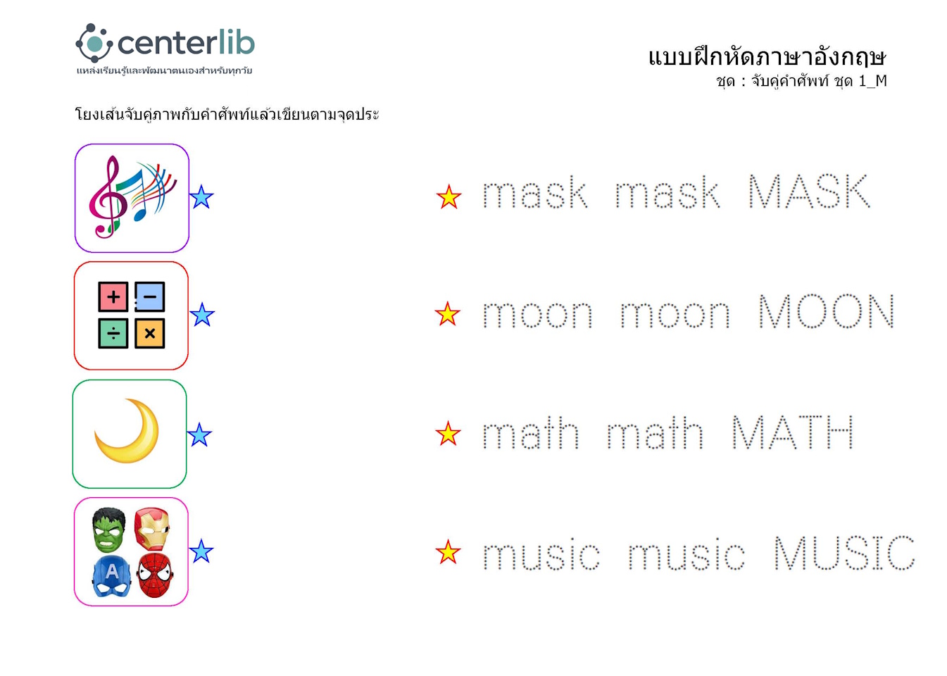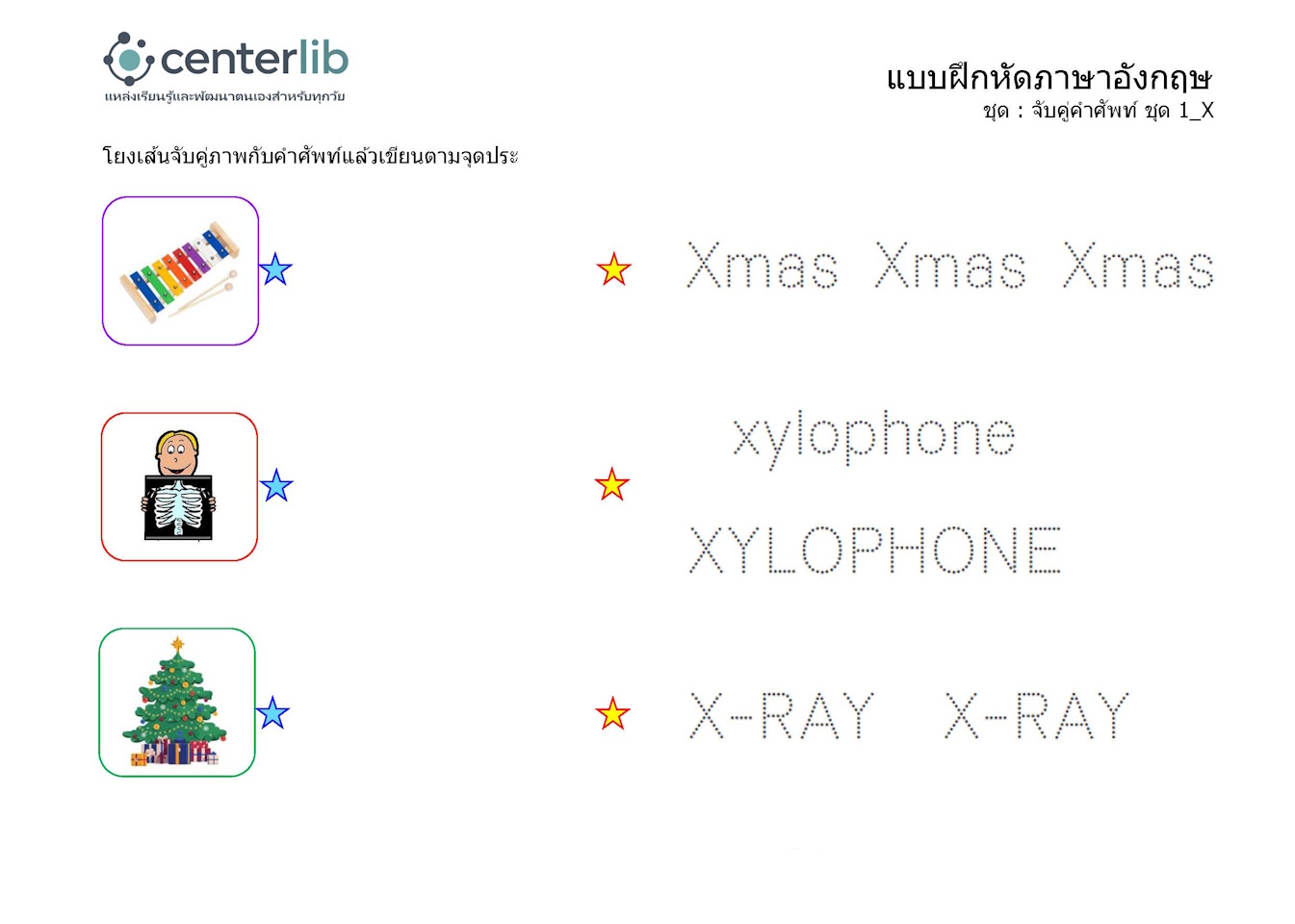 ลากเส้นตามรอยประ และจับคู่คำศัพท์