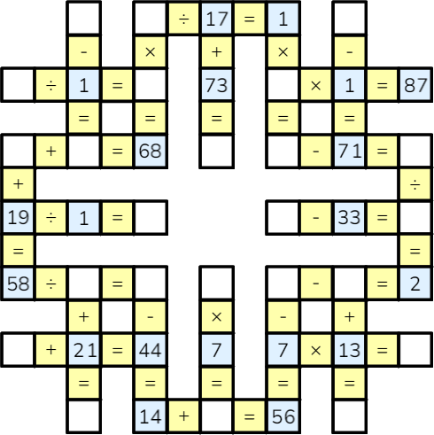 | 17÷17=1 4÷1=4 87×1=87 39+29=68 87-71=16 19÷1=19 41-33=8 58÷1=58 63-61=2 23+21=44 7×13=91 14+42=56 |
