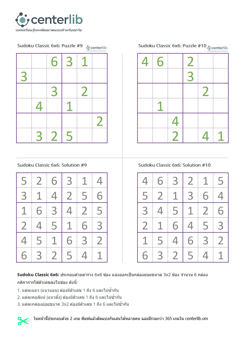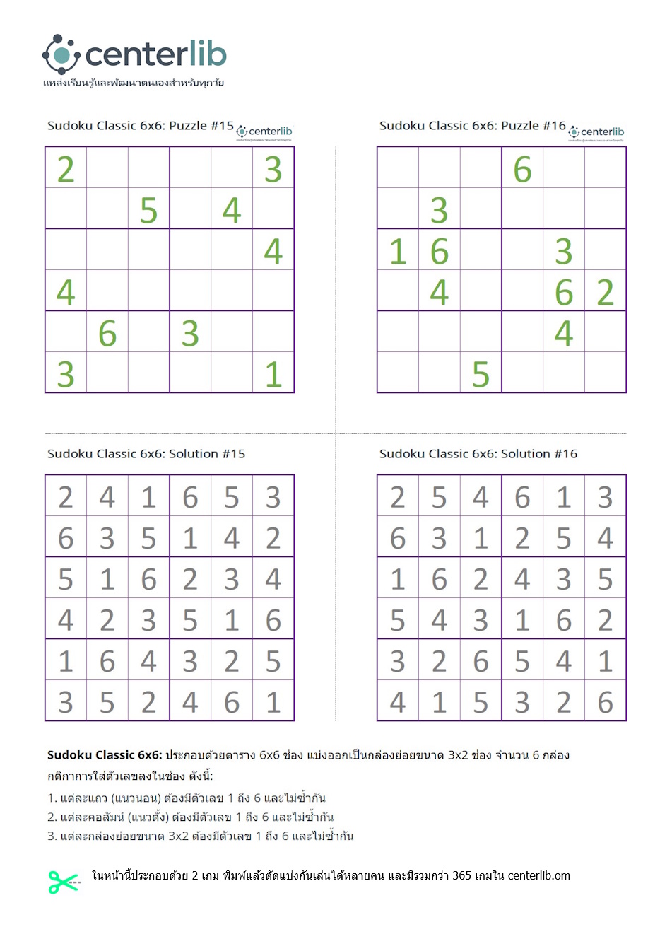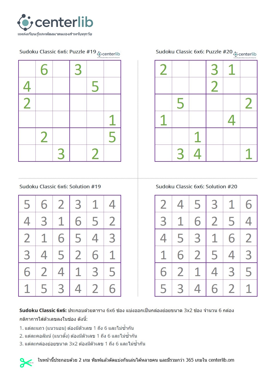 ในหน้านี้ประกอบด้วย 2 เกมพร้อมเฉลย พิมพ์แล้วตัดแบ่งกันเล่นได้หลายคน และมีรวมกว่า 365 เกมใน centerlib.com