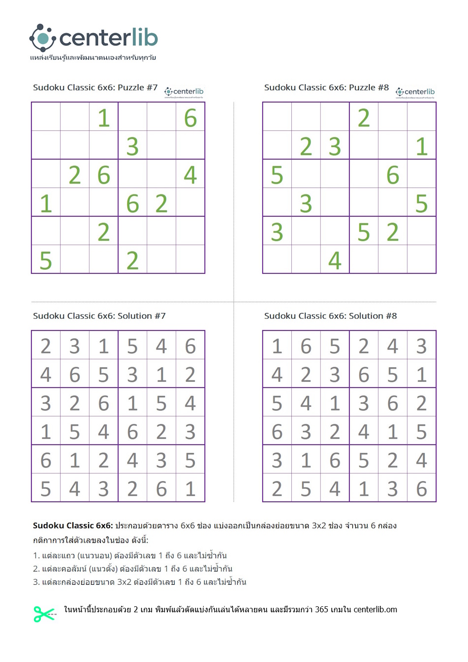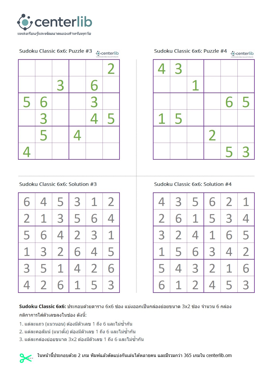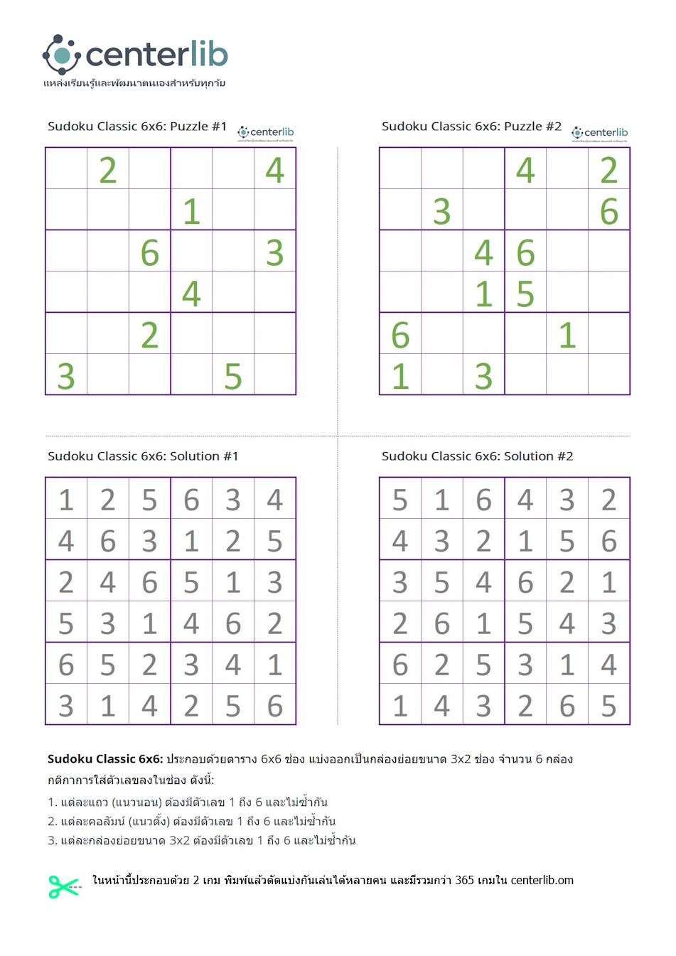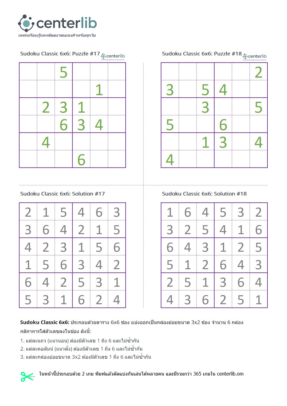 ในหน้านี้ประกอบด้วย 2 เกมพร้อมเฉลย พิมพ์แล้วตัดแบ่งกันเล่นได้หลายคน และมีรวมกว่า 365 เกมใน centerlib.com