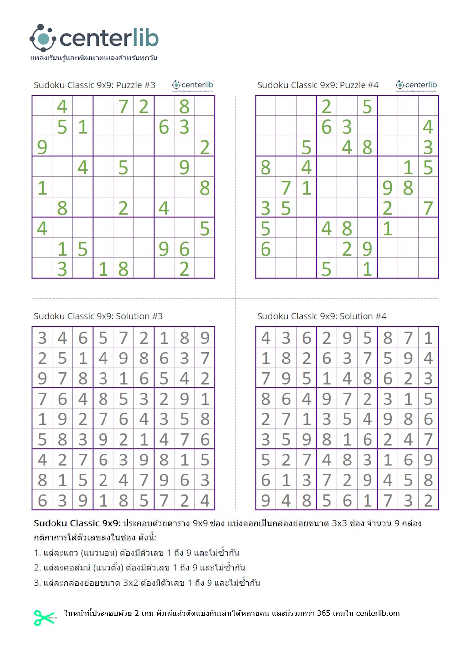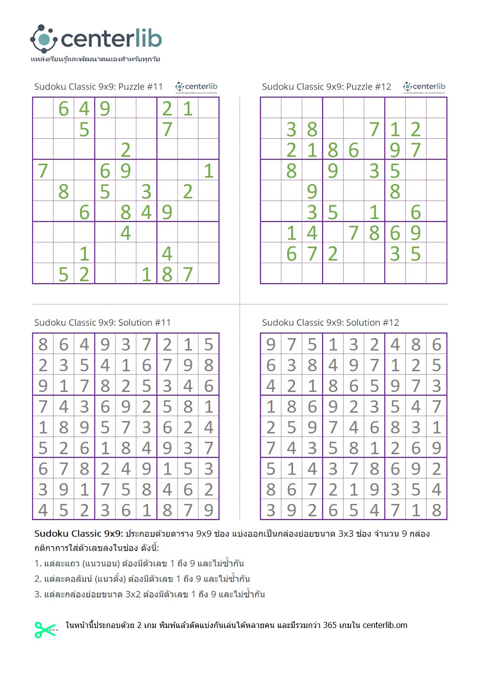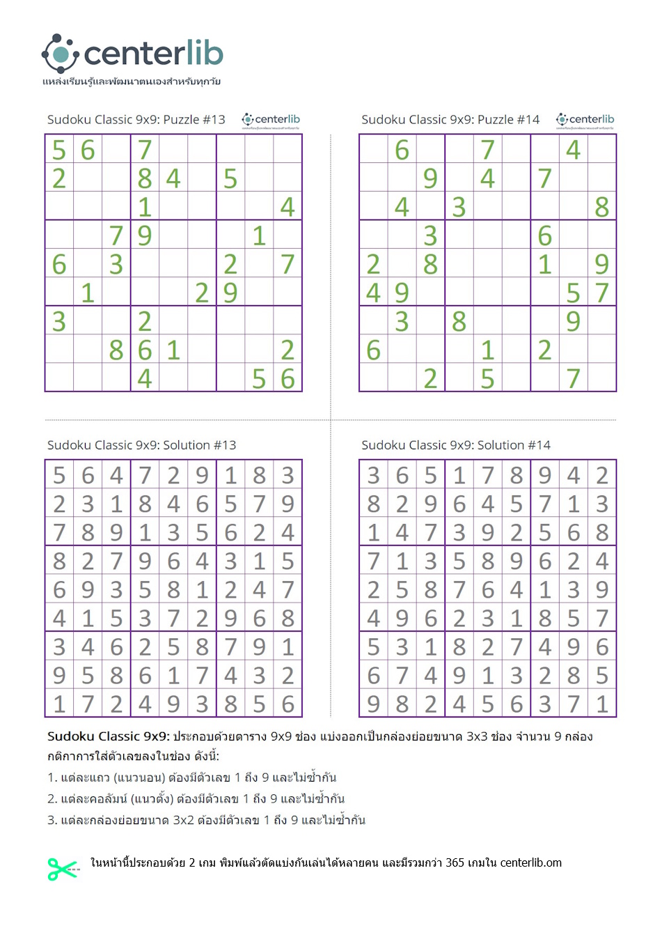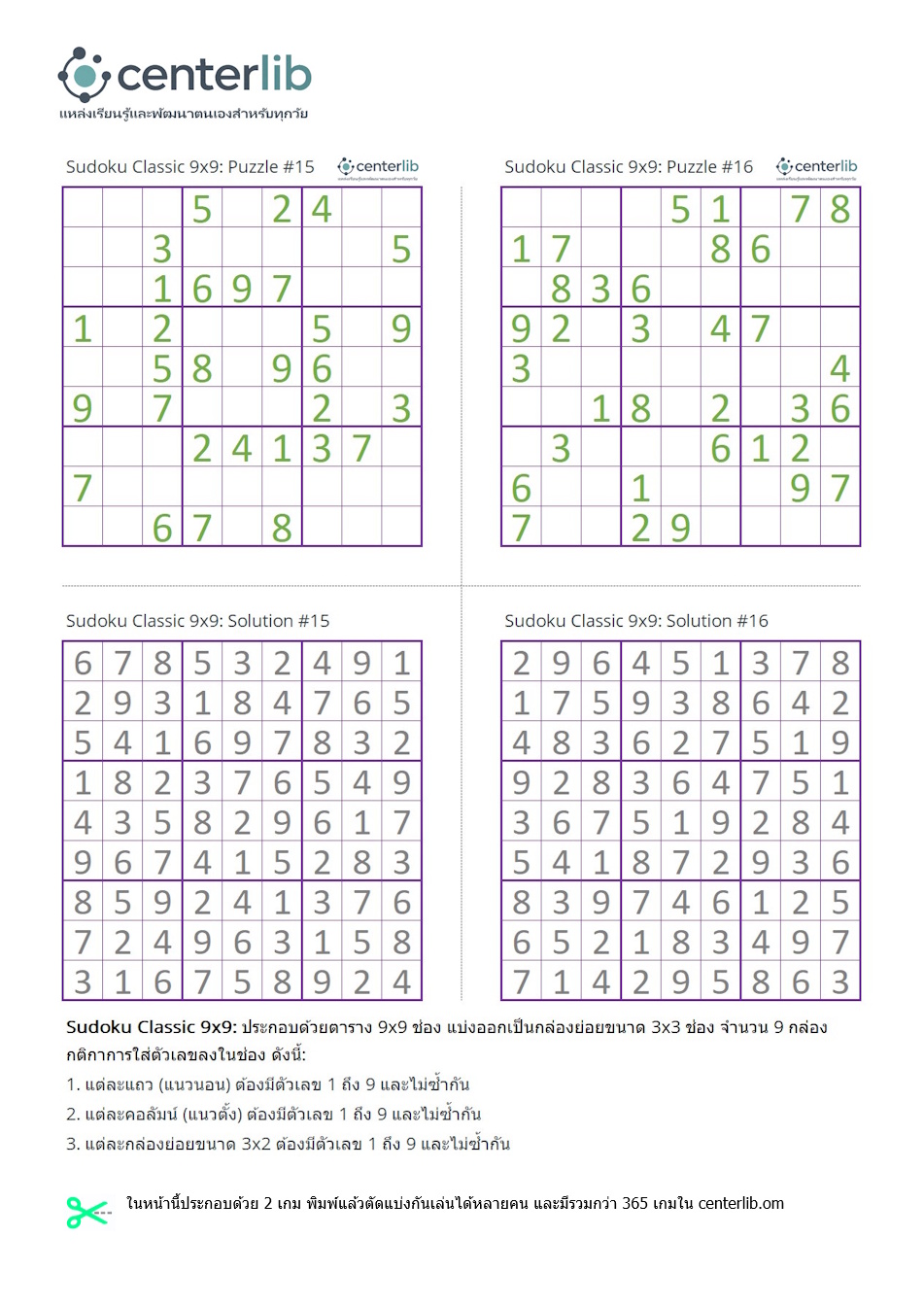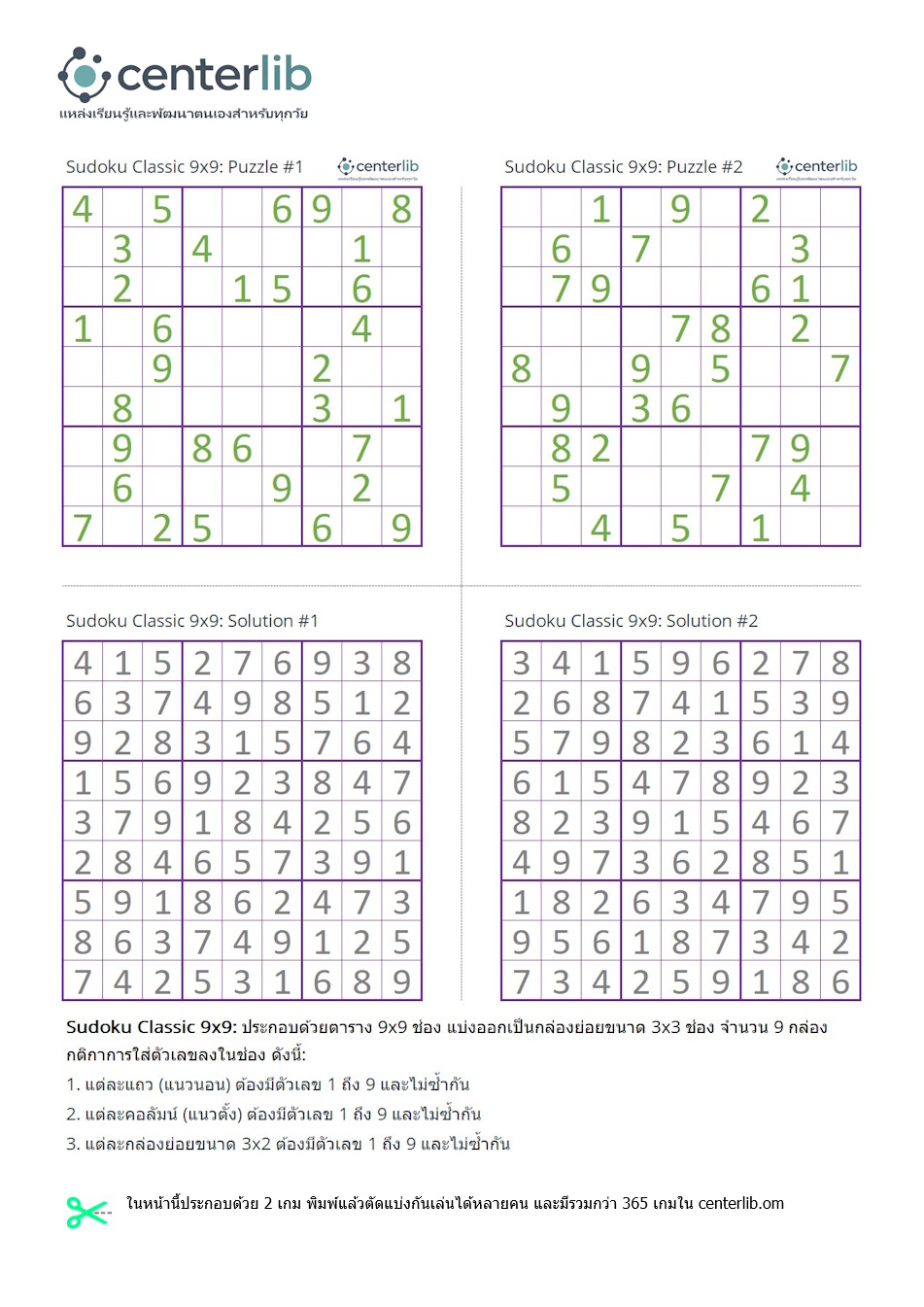 ในหน้านี้ประกอบด้วย 2 เกมพร้อมเฉลย พิมพ์แล้วตัดแบ่งกันเล่นได้หลายคน และมีรวมกว่า 365 เกมใน centerlib.com