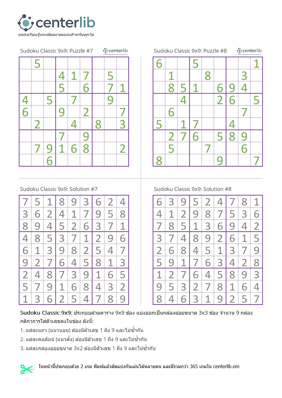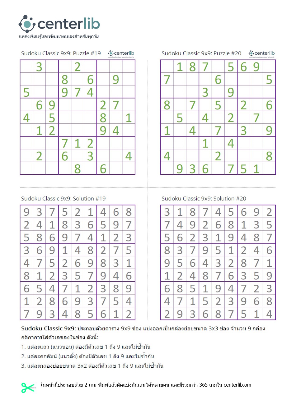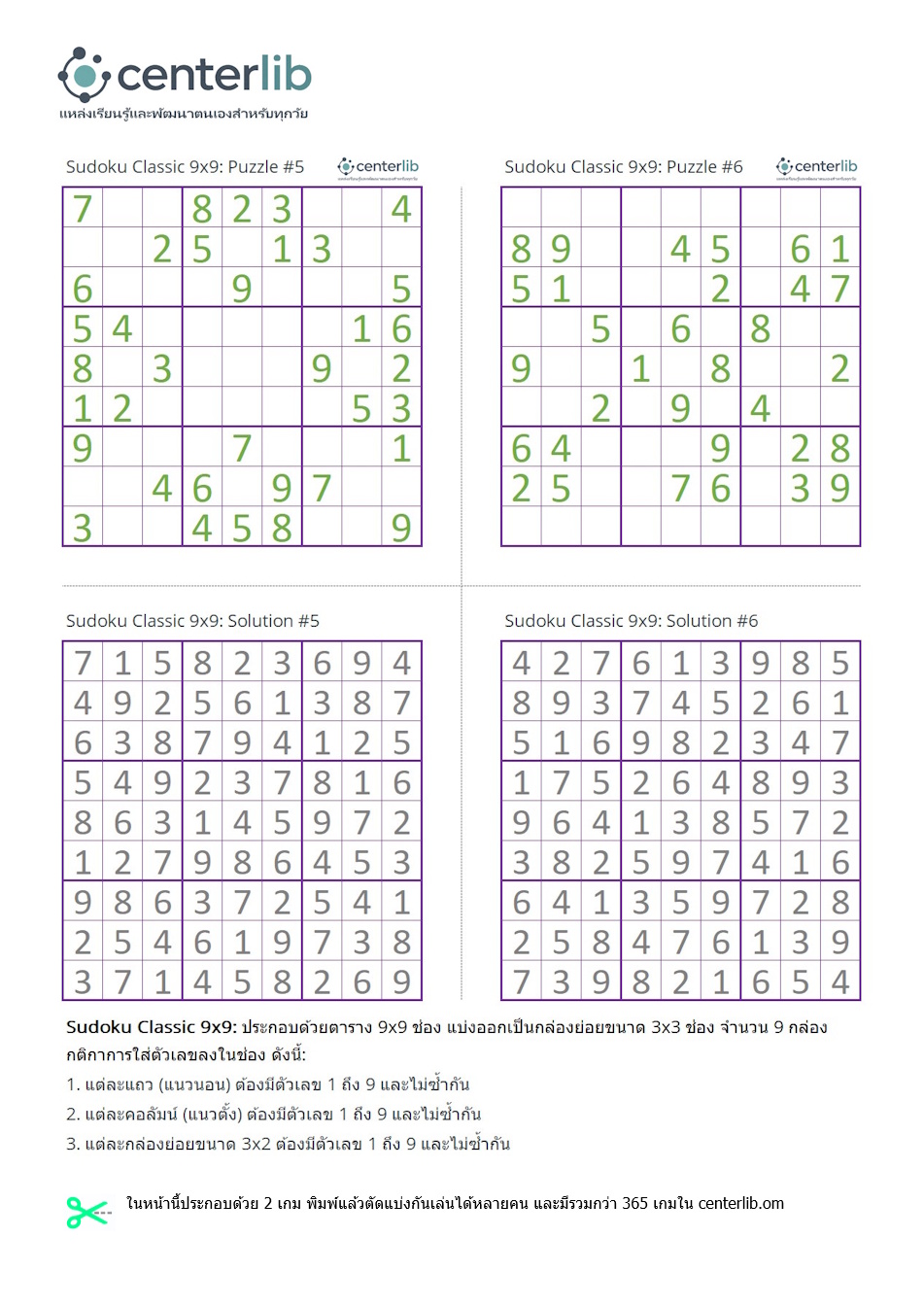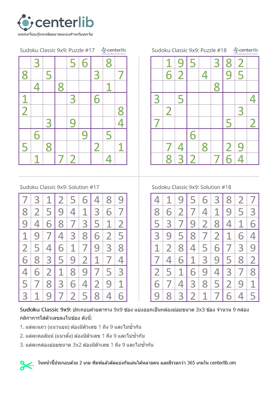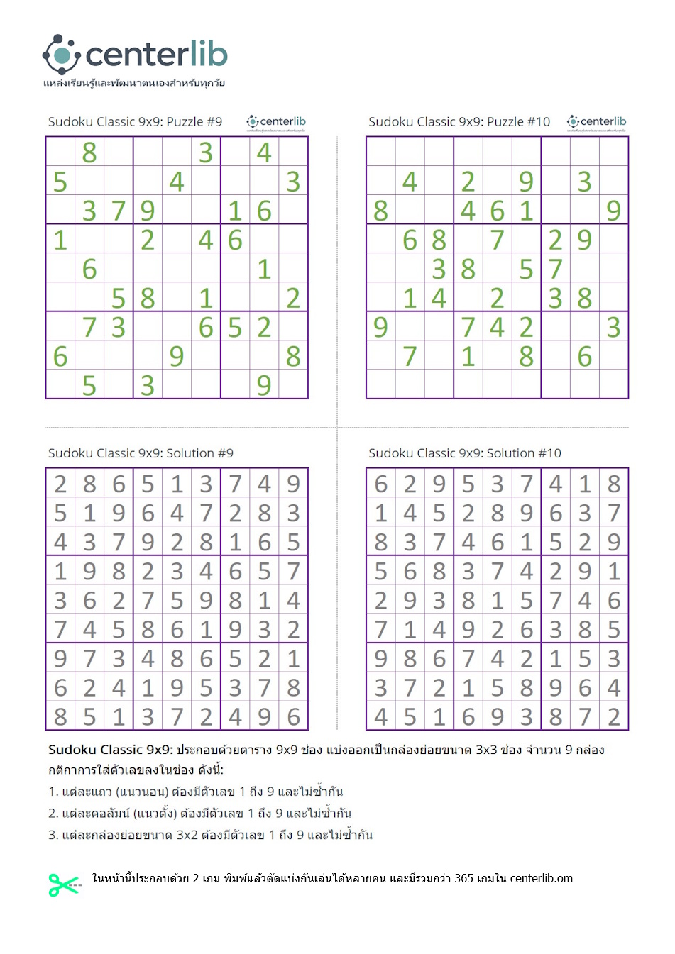 ในหน้านี้ประกอบด้วย 2 เกมพร้อมเฉลย พิมพ์แล้วตัดแบ่งกันเล่นได้หลายคน และมีรวมกว่า 365 เกมใน centerlib.com
