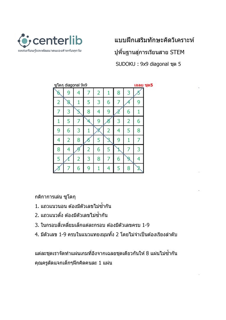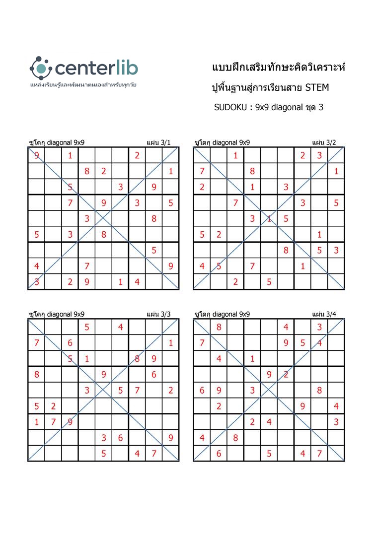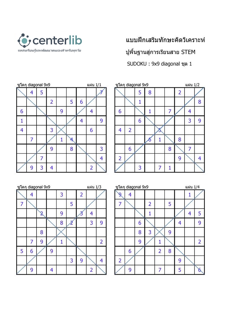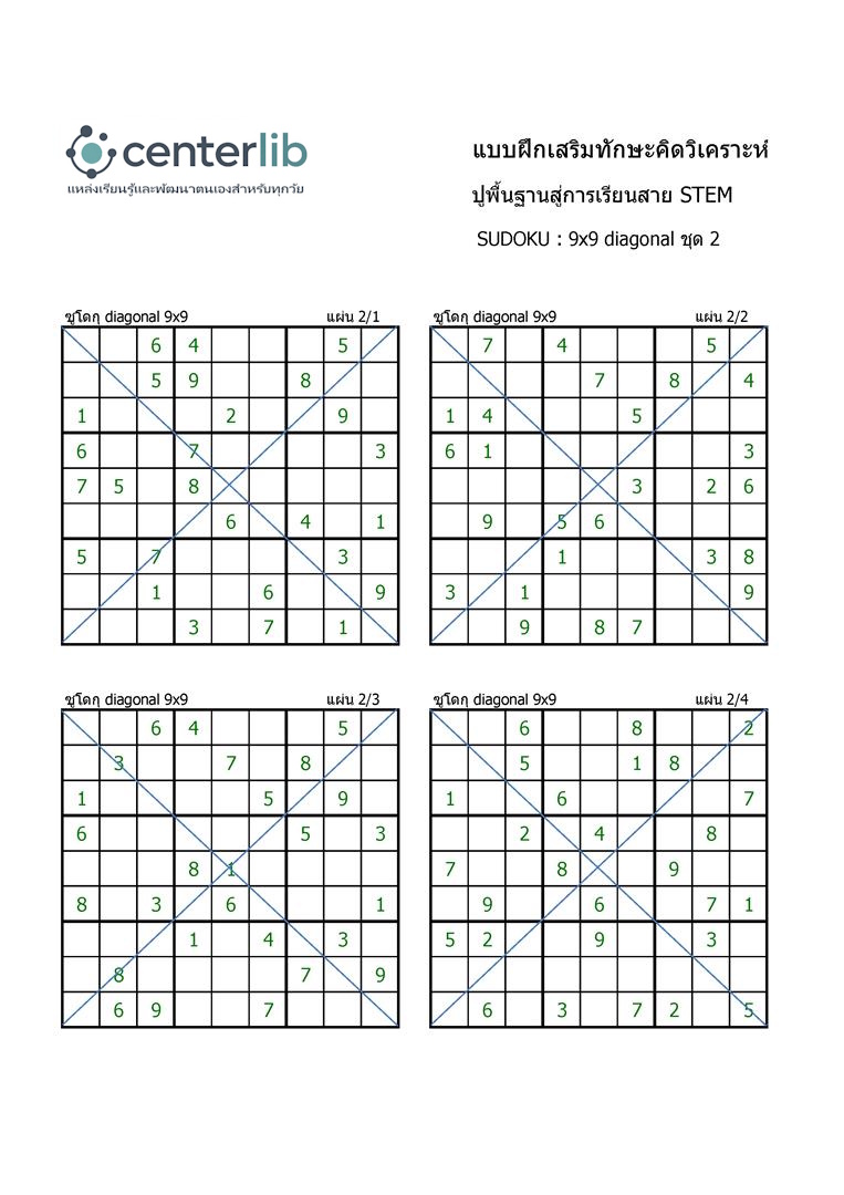 Sudoku Diagonal หรือที่บางครั้งเรียกว่า Sudoku X เป็นรูปแบบของเกม Sudoku ที่มีกฎเพิ่มเติมนอกจากกฎพื้นฐานของ Sudoku ที่นอกจากจะให้ตัวเลข 1-9 ปรากฏในแต่ละแถว (row) แต่ละคอลัมน์ (column) และแต่ละกรอบ 3x3 ไม่ซ้ำกันแล้ว ใน Sudoku Diagonal ยังมีกฎเพิ่มเติมอีก คือ; ตัวเลข 1-9 ทั้งในแนวทแยงหลักจากมุมซ้ายบนไปมุมขวาล่าง แนวทแยงหลักจากมุมขวาบนไปมุมซ้ายล่าง ต้องไม่ซ้ำกันอีกด้วย ดังนั้น Sudoku Diagonal จึงมีความท้าทายเพิ่มขึ้นเนื่องจากต้องคำนึงถึงแนวทแยงหลักทั้งสองแนวอีกด้วย