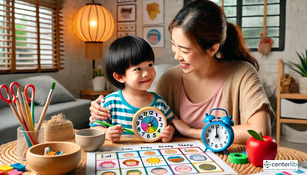 การสร้างกิจวัตรประจำวันเป็นวิธีที่ดีในการสอนให้ลูกเข้าใจการจัดการเวลา เด็กจะเรียนรู้ว่าเวลาไหนควรทำอะไรและต้องจัดการกิจกรรมอย่างไรในแต่ละวัน
