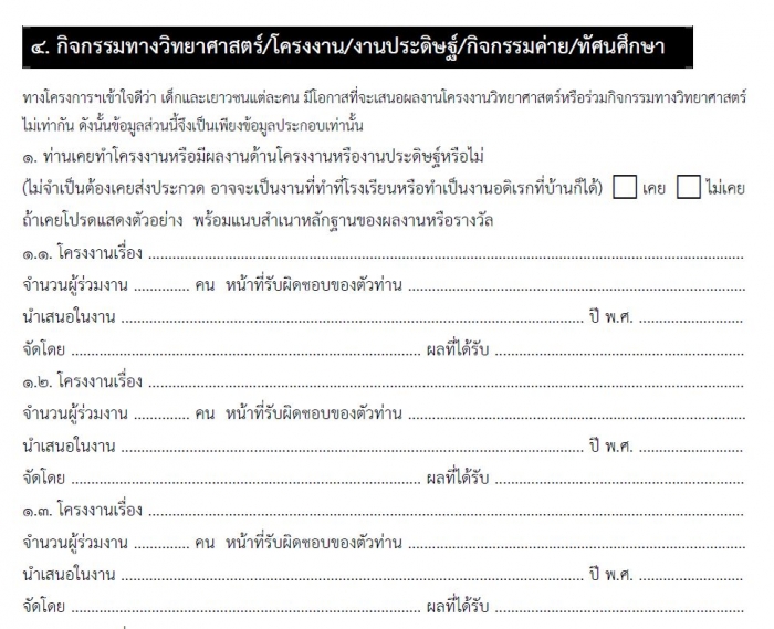 เด็กหลายคนถอดใจไปตั้งแต่เห็นใบสมัครแล้ว :app: มีเสียงบ่นพึมว่าทำไมต้องยากและเยอะขนาดเน้!! :scare: ก็น่าจะเป็นเพราะทางกรรมการอยากจะรู้จักตัวตนของผู้สมัครครบทุกมุม และโครงการนี้ก็ไม่มีการทดสอบใดๆ คัดเด็กจากใบสมัครเลย