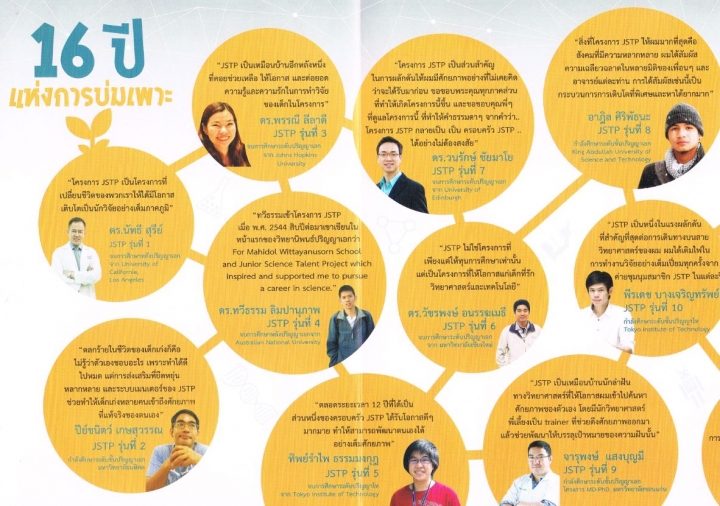 เมื่อครั้งพาลูกไปเข้าค่ายถนนนักวิจัยรุ่นเยาว์ เขาจัดห้องให้ผู้ปกครองได้เข้าประชุมด้วยโดยมี นักวิจัย สวทช. และ JSTP รุ่นพี่ มาแนะนำโครงการ และบอกเล่าบรรยากาศของครอบครัว JSTP ซึ่งรุ่นพี่และนักวิทยาศาสตร์พี่เลี้ยงจะดูแลรุ่นน้องต่อกันเป็นทอดๆ รุ่นพี่(ขู่)บอกว่าใบสมัครโครงการหนามาก เห็นแล้วน้องๆอย่าตกใจนะขอให้ลองสมัครดู (เหมือนจะให้เตรียมใจก่อน) แม่ได้ฟังแล้วก็แอบฝันอยากให้ลูกได้เข้าโครงการ