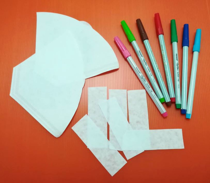 1. ตัดกระดาษกรองเป็นแถบยาวๆ 5 นิ้ว (ถ้าสั้นเกินไป สีจะไม่มีพื้นที่ให้วิ่งค่ะ)