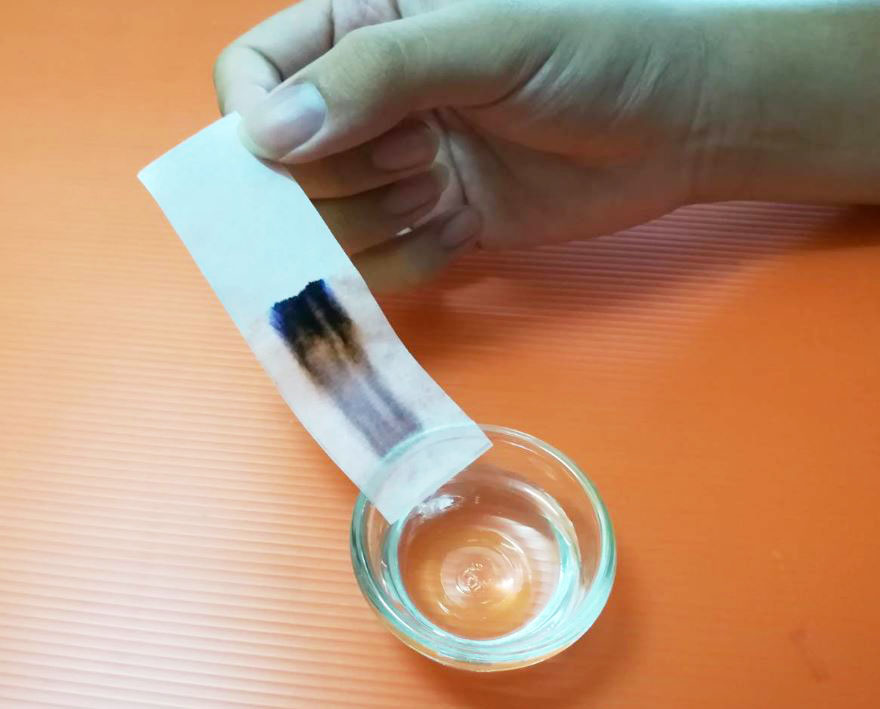 4. รอดู สังเกตแถบสีที่เริ่มวิ่งไต่สูงขึ้นไปบนกระดาษกรอง เธอเห็นสีอะไรซ่อนอยู่?