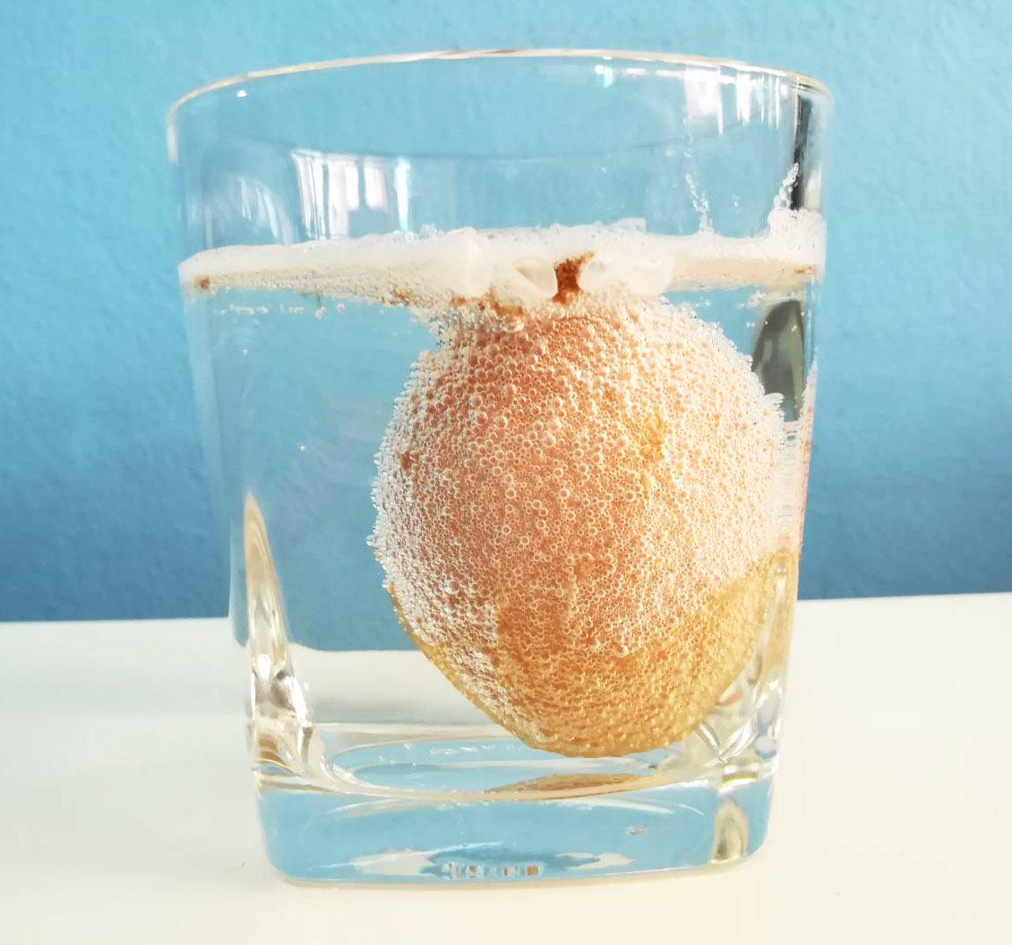 เปลือกไข่ประกอบด้วยแคลเซียมคาร์บอเนต หรือเรียกง่ายๆว่า “หินปูน” ซึ่งทำปฏิกิริยากับกรดอะซิติกในน้ำส้มสายชู ได้เป็นก๊าซคาร์บอนไดออกไซด์ออกมา ดังนั้นเมื่อเรานำไข่แช่ไข่ไว้ในน้ำส้มสายชูจะสังเกตเห็นฟองเล็กๆปรากฏขึ้นที่ผิวเปลือกไข่ในทันที และเมื่อใช้ระยะเวลานานขึ้นฟองก็จะห่อหุ่มเปลือกไข่หนาแน่นขึ้นด้วย