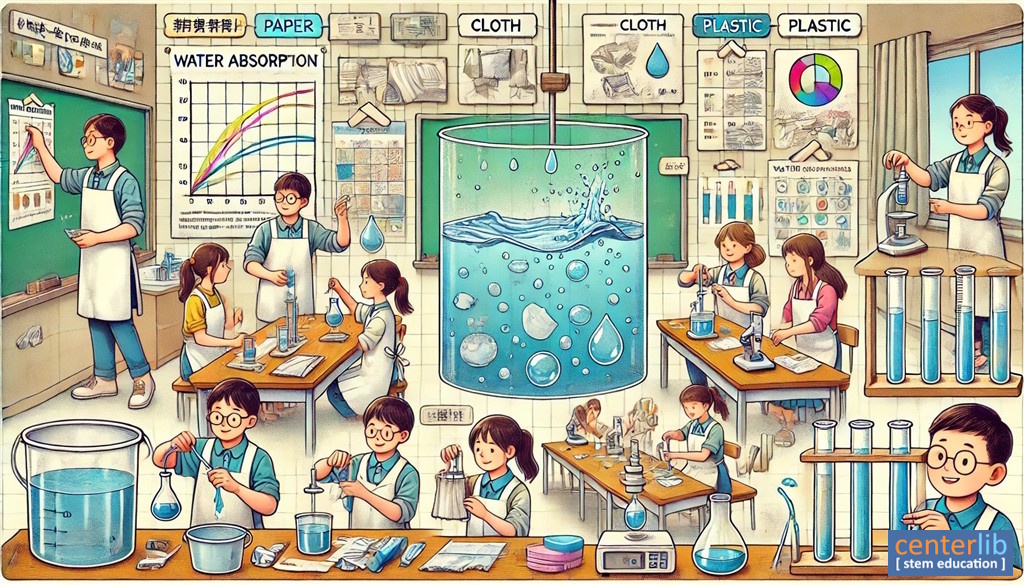 นักเรียนได้รับมอบหมายให้ทำการทดลองเพื่อศึกษาการดูดซับน้ำของวัสดุต่าง ๆ เช่น กระดาษ ผ้า และพลาสติก นักเรียนจะต้องทำการวิจัย ออกแบบการทดลอง สร้างการทดลอง และทดสอบการดูดซับน้ำของวัสดุแต่ละชนิด