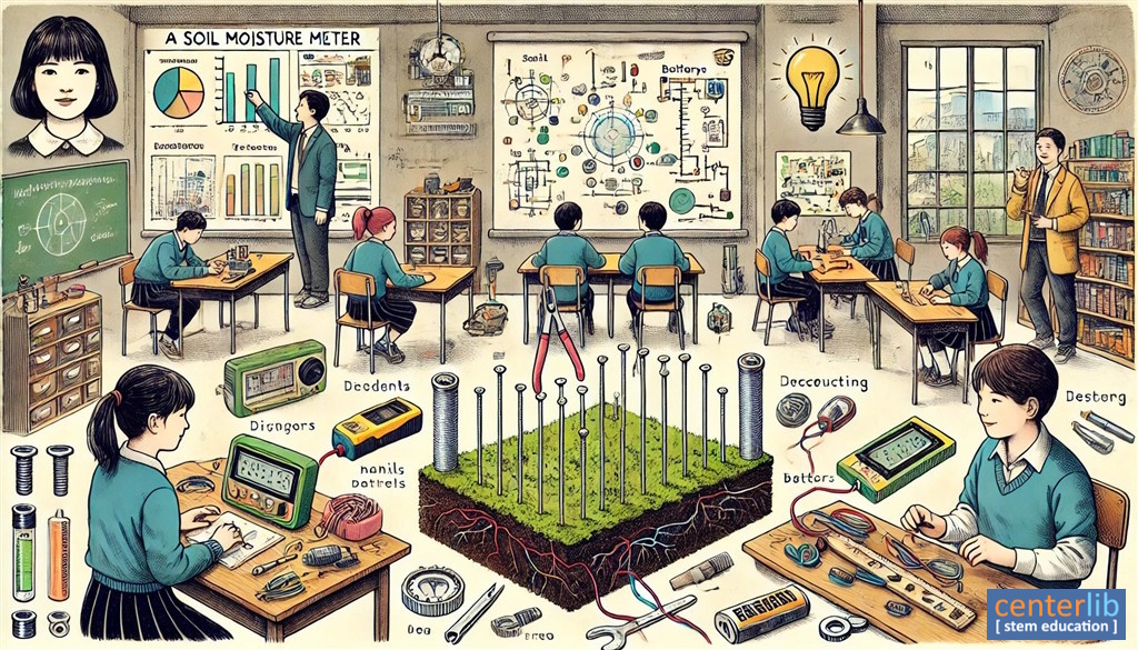นักเรียนได้รับมอบหมายให้สร้างเครื่องวัดความชื้นในดินโดยใช้วัสดุที่หาได้ในบ้าน นักเรียนจะต้องทำการวิจัย ออกแบบ สร้าง และทดสอบการทำงานของเครื่องวัดความชื้นในดิน