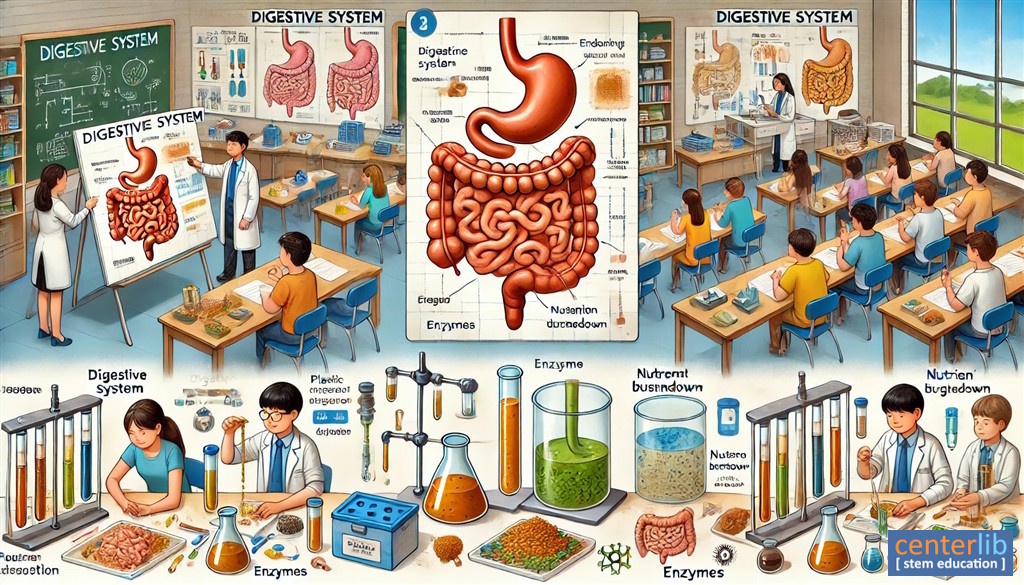 นักเรียนได้รับมอบหมายให้สร้างโมเดลของระบบทางเดินอาหารของมนุษย์ และทำการทดลองเพื่อศึกษากระบวนการย่อยอาหาร นักเรียนจะต้องทำการวิจัย ออกแบบ สร้าง และทดสอบการทำงานของโมเดลระบบทางเดินอาหาร